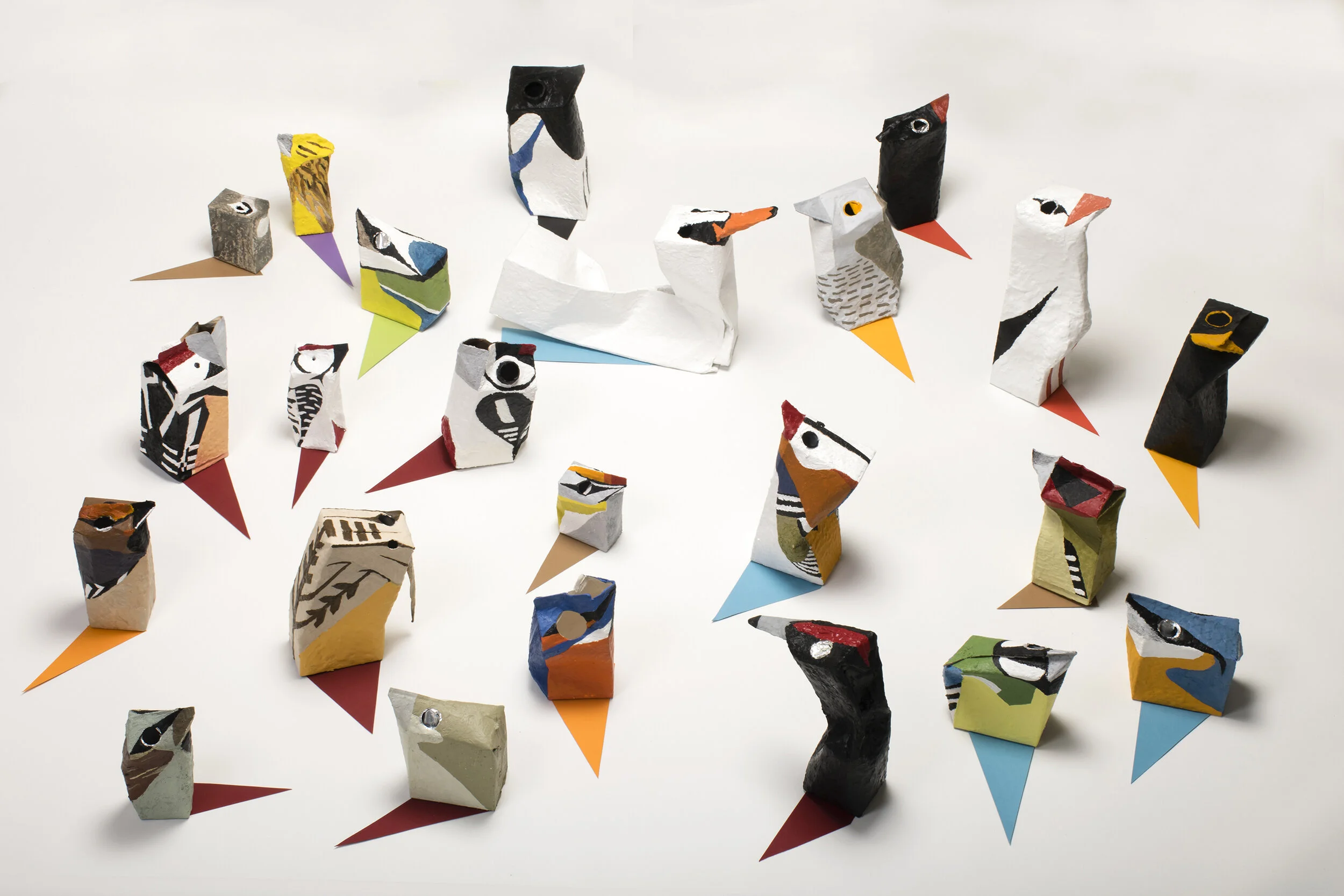 Madeleine Kelly, Canberra birds: Cute craft for the painting archive, 2018 encaustc on cardboard, 19 parts ranging from 8 x 11 x 11 to 27 x 27 x 9 cm.